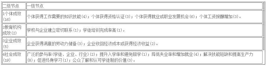 根据编码结果,高质量的现代学徒制应能使个体、教育机构、企业以及社会均获得收益(见表6)。具体说来,个体应能够获得工作所需要的知识技能和相关资格认证,从而获得满意的就业或职业发展机会,在经济回报上体现为工资收入的提高。教育机构应能通过开展现代学徒制与企业建立起更为紧密的联系,提高学徒培训完成率。高质量的现代学徒制应能使企业获得合格且忠诚度高的劳动力,还应能使企业通过学徒劳动获取一定经济收益,至少应能收回成本。此外,作为一项综合性的教育改革,现代学徒制还应当取得多方面的社会成效,如广泛的社会参与度、更高的就学率与就业率、更高的社会生产力、促进终身学习以及促进公众了解和认可学徒制等。联合国教科文组织(UNESCO)曾在2012年的第三届国际职业技术教育与培训大会上指出“成功的职业技术教育与培训政策和改革必然触及多个错综复杂的政策领域”,并主张用经济、公平和改革三重透镜来审查职业教育举措。[19]借用此透镜方法可以发现,国际组织眼中的高质量现代学徒制也正是应在经济、公平和改革三方面均能获得收益的:经济角度上更好地满足劳动力市场的技能需求,社会公平角度上更好地促进不同群体在入学和职业生涯发展结果的机会均等,改革角度上促进社会向终身学习社会以及尊重技能劳动者的社会氛围转变。虽然国际组织的倡议文本均没有对“现代学徒制的质量是什么”做出明确界定,但从这些效益追求上可以看出,它意味着效率、公平和变革。