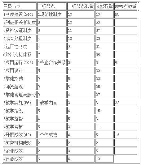 本研究使用NVivo 12软件对文本进行三级编码。一级编码采用开放编码,编码单位是具有动宾结构的完整质量要求表述。需要说明的是,由于这些倡议文件对学徒制质量要求阐述的详略不尽相同,本研究仅对倡议中指标性的文字表述进行编码,阐述性的文字表述仅作参考,不列入编码。这样既可以保证指标要素的全面覆盖,又可以提高参考点数量统计的参考价值。二级编码采用属类编码,即寻找开放编码之间的属类关系,进行归并。三级编码也采用属类编码,对二级编码继续按属类关系进行再归并,从而形成现代学徒制质量的三级指标体系。