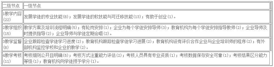 依据编码结果,国际组织对现代学徒制的质量要求体现在制度建设、项目运行、教学实施和开展成效四个方面。