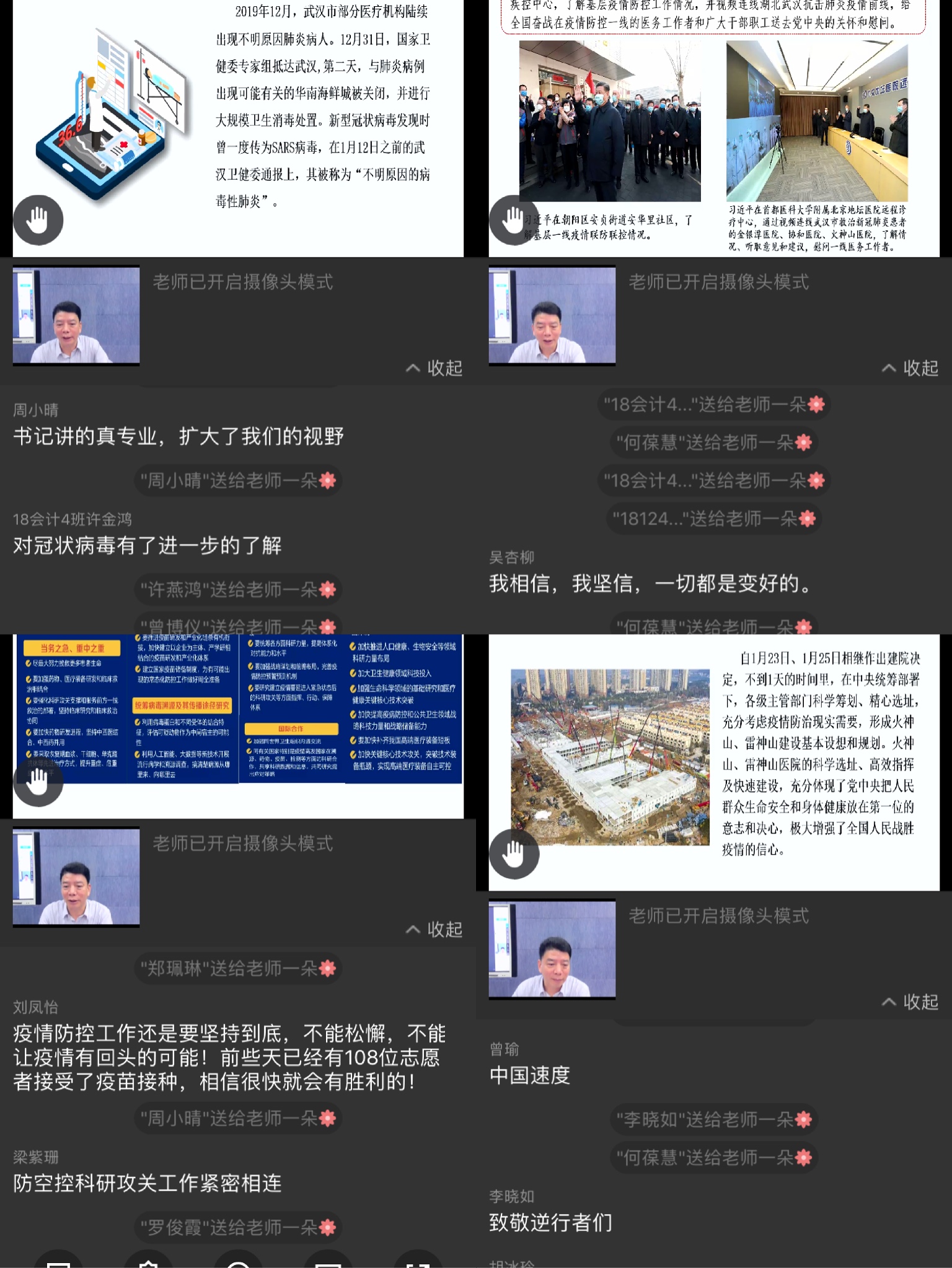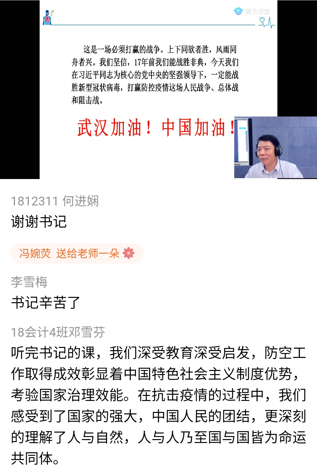 在直播的过程中,汤书记就疫情防控中的某些问题与同学们进行了线上互动,大家积极参与讨论,纷纷留言,热情献花。在举国上下全力抗“疫”之际,汤书记这堂特殊的思政“第一课”,及时将疫情防控中涌现的具体实践转化为鲜活的课堂,通过多样的形式和丰富的素材,让参加授课的同学们收获良多,既提高了疫情防控的意识,又加深了对中国特色治理体系和治理能力的认识,还坚定了“四个自信”。同学们纷纷表示,要在此次疫情防控阻击战中践行初心和使命,努力学习,主动担当,积极作为,服务社会。