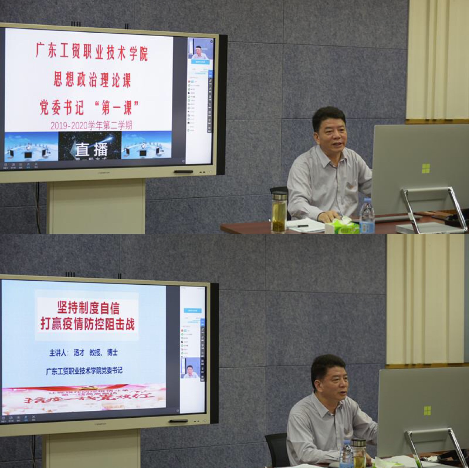 为深入贯彻习近平总书记关于坚决打赢疫情防控阻击战的重要指示精神,按照广东省教育厅关于做好2020年春季学期高校党委书记、校长上第一堂思政课工作的通知要求,3月25日上午,学校党委书记汤才以《坚持制度自信打赢疫情防控阻击战》为题,与学生相约“云端”,在天河校区综合楼演播厅从多个方面为学生讲授了一堂生动精彩的网络思政课。