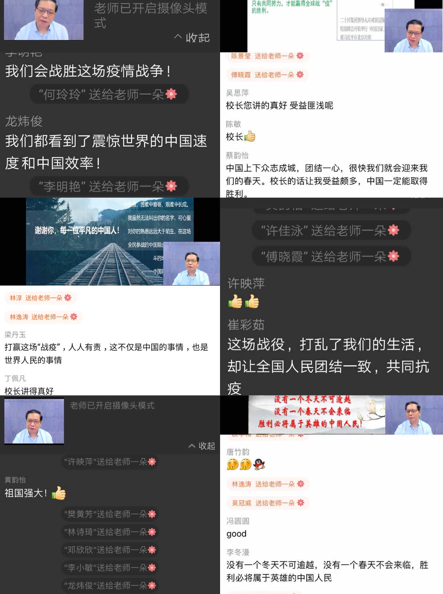 何校长在整场讲座中既讲到了“中国故事”和“中国速度”,又讲到了“工贸故事”和“工贸速度”,使同学们对“中国制度”和我们学校的具体做法都有了更加深入的了解。在听课过程中,同学们热情参与,积极互动,纷纷在网上留言或送花,表示此次思政课进一步增强了同学们学好知识本领报效国家的使命与担当,在战“疫”的路上,将以更加昂扬的姿态书写自己精彩的人生。