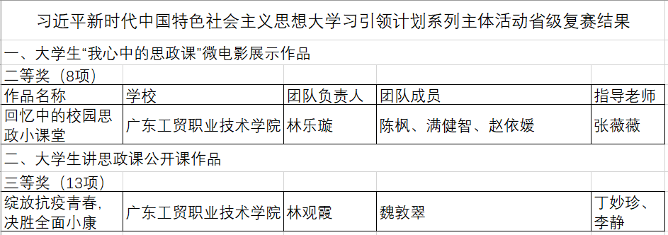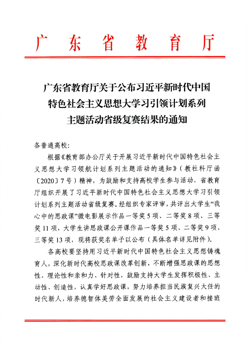 由广东省教育厅组织开展的习近平新时代中国特色社会主义思想大学习引领计划系列主题活动省级复赛落下帷幕,365官网马克思主义学院教师指导的两组作品分别荣获“我心中的思政课”微电影展示二等奖、大学生讲思政课公开课三等奖。