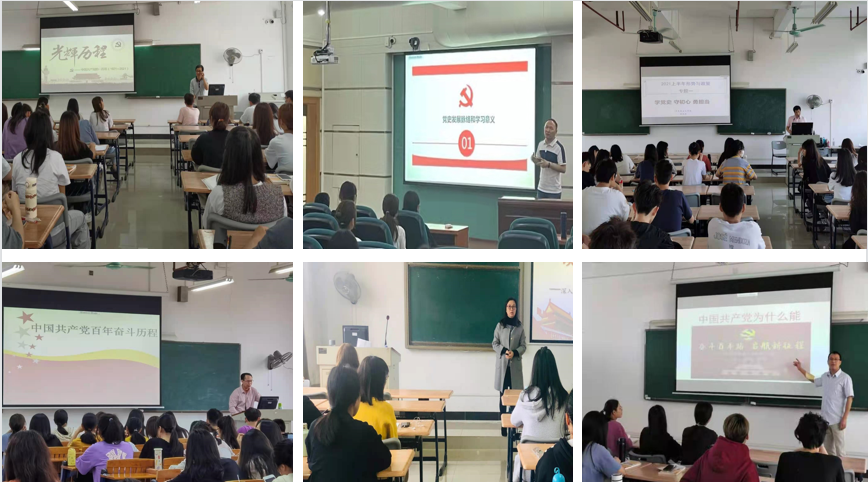 在马院直属党支部的统一安排下,各任课老师以教研室(党小组)为单位进行了集体备课,将党史教育分别融入到《思想道德修养与法律基础》、《毛泽东思想和中国特色社会主义理论体系概论》、《马克思主义中国化进程与青年使命担当》等课程,做到了全体马院教师和任课班级的全覆盖,宣讲内容有《百年风雨兼程 百年沧桑巨变—-百年党史:共产党人砥砺前行的动力与丰富生动的教科书》、《红船精神:开天辟地》、《毛泽东诗词中的党史》、《从万里长征到星辰大海》、《新中国70年奋斗与辉煌》、《改革开放:中国共产党的一次伟大觉醒》、《中国共产党领导脱贫攻坚的经验与启示》、《新时代中国共产党人的历史使命》、《观百年党史 悟初心使命》等,精彩纷呈,生动再现了中国共产党披荆斩棘、砥砺前行的百年风雨奋斗历程。