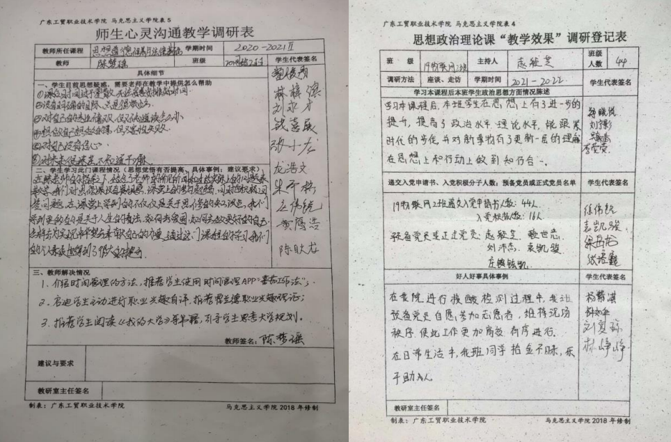 根据校党委对党史学习教育的统一部署,马克思主义学院直属党支部积极将党史学习同思政课教学相结合,同解决学生实际问题相结合,广泛发动教师依托思政课堂开展的“师生心灵沟通”、“教学效果调研”活动,把“我为群众办实事”做深做实做活,多渠道为学生办实事解难题,老师在沟通中把握学生学习需求,在梳理学生困惑中找到精准的教学切入点,有效推进党史学习教育与思政课教学有机融合。