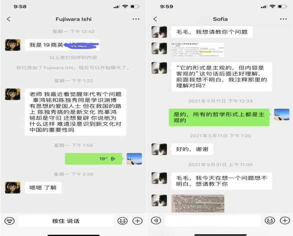 晏意华老师通过微信聊天帮助学生答疑解惑