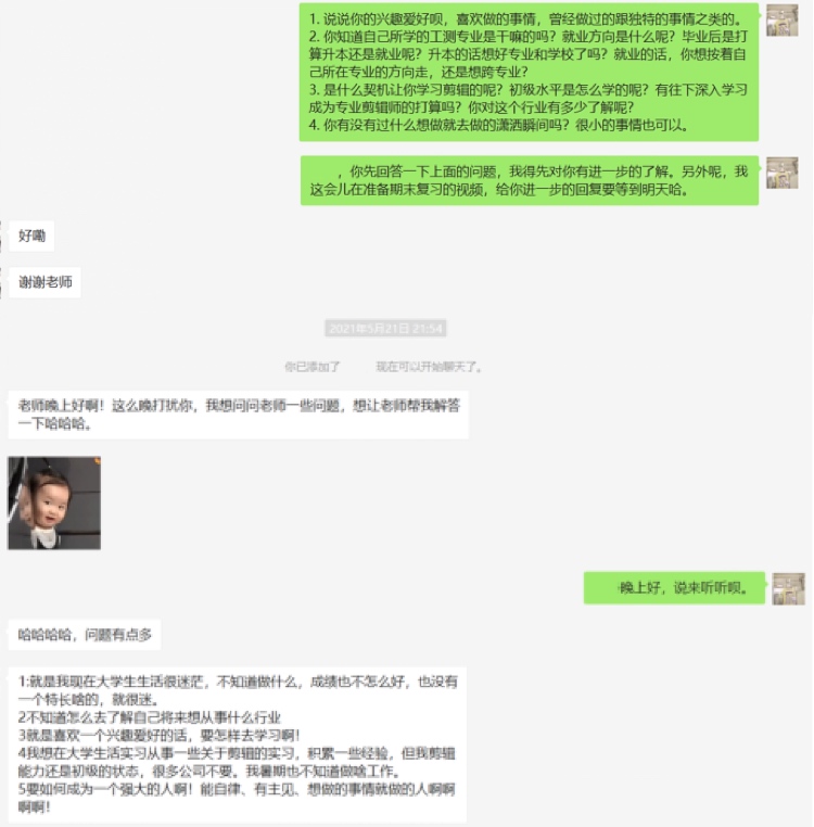 方瑜聪老师通过微信聊天帮助学生解决实际问题