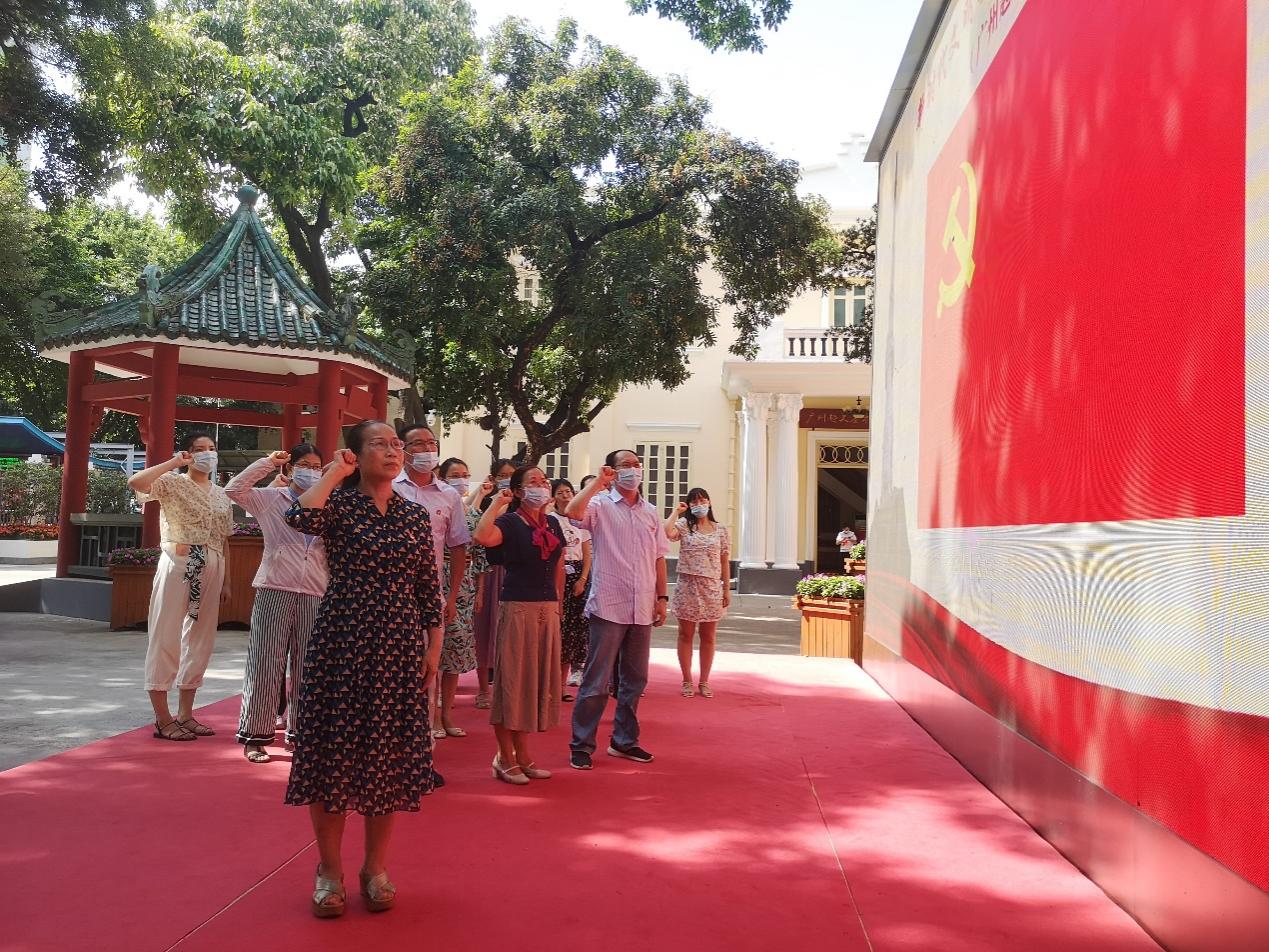 在广州起义纪念馆的展览馆前,全体党员面对鲜红的党旗庄严宣誓,一句句铿锵有力的入党誓词,让大家的心灵再次接受洗礼。