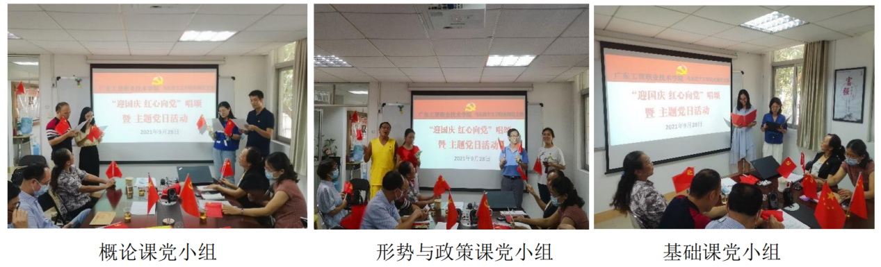 忆往昔峥嵘岁月,看今朝幸福安康。党支部三个党小组精心筹备,以诗歌诵读和唱响红歌形式为祖国庆生。“祖国,我是你日夜奔涌的河流,每一滴水都携带者幸福的闪电。”概论组四位教师率先登场,诵读《祖国,我是你日夜奔涌的河流》这首热情洋溢的诗歌,深情而坚定地述说心中对党和祖国的渴慕和赞美,情感真挚、感人肺腑,现场气氛逐渐高涨;“五星红旗迎风飘扬,胜利歌声多么响亮!歌唱我们亲爱的祖国,从今走向繁荣富强!”一曲《歌唱祖国》让人思绪万千、心潮澎湃,形势与政策组的四位教师用嘹亮的歌声回顾了祖国发展的光辉历程,庆祝美好新时代,唱响美好新生活,传递着对党和祖国的忠诚与热爱,激昂的旋律振奋着在场的每一位;“祖国,我爱你源远流长灿烂的历史,我爱你每一寸土地上的花朵,我爱你风光旖旎壮丽的河山,我爱你人民的性格坚韧执着。”基础组两位教师不甘示弱,伴着婉转的旋律,和着铿锵有力的节拍,她们声情并茂地朗诵了《我的祖国》红色赞歌,倾诉着对祖国母亲和中国共产党的无限感激和热爱。活动现场掌声阵阵、气氛热烈感人,与会教师深受鼓舞。