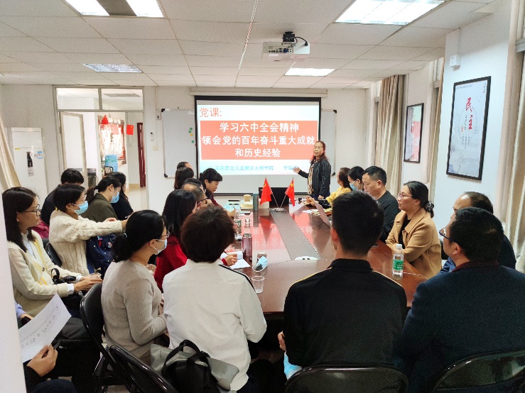为深入学习贯彻党的十九届六中全会精神,进一步提升党员教师的理论素养、增强使命意识和政治责任感,11月30日下午,马克思主义学院直属党支部组织开展了“学习贯彻党的十九届六中全会精神 领会党的百年奋斗重大成就和历史经验”专题党课学习,马院直属党支部书记、马院常务副院长李瑞清主讲,全体教职工党员参加了学习。