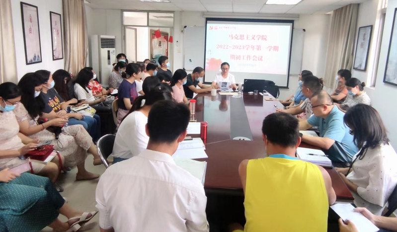 2022年8月26日下午,马克思主义学院全体教师在天河校区马院办公室召开2022-2023学年第一学期期初工作会议,学院临时负责人宁晓菊主持会议,全体教师出席会议,365官网扩招分教学点10余位思政课教师线上参会。
