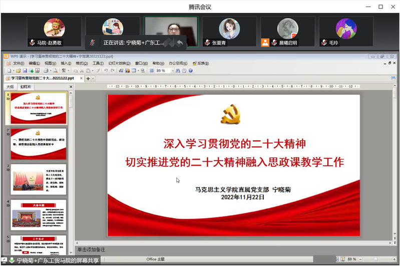 最后,马院负责人宁晓菊指出,希望老师们在目前宣讲和融入工作全方位开展基础上,继续深入贯彻落实《中共中央关于认真学习宣传贯彻党的二十大精神的决定》要求,切实提高学习宣传、贯彻落实党的二十大精神的思想自觉和行动自觉,深刻理解将党的二十大精神融入思政课的目标要求,把握好将党的二十大精神融入思政课的基本原则和具体要求。希望老师们持续贯彻落实好11月12日省教育厅召开的党的二十大精神融入思政课教学集体备课会精神,持续贯彻落实好学校党委学习贯彻党的二十大精神宣讲动员会暨专题宣讲会精神,按照学校党委制定的宣讲实施方案要求和安排,把握关键要点,创新教学方式,进一步提升融入的学理性、系统性、针对性和有效性,使党的二十大精神真正在师生中内化于心、外化于行,指引工贸学子成长为有理想、敢担当、能吃苦、肯奋斗的新时代好青年。