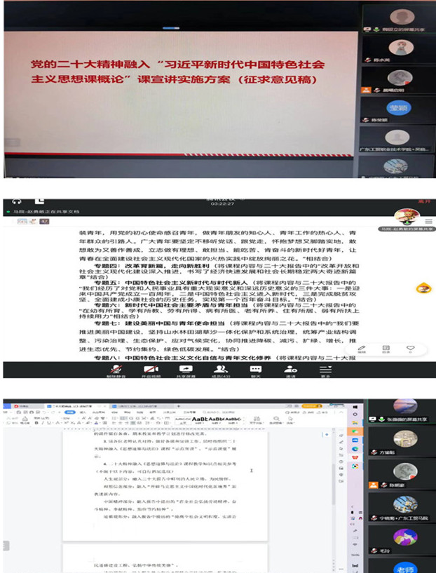 11月22日,马克思主义学院召开党的二十大精神融入思政课教学集体备课会,组织全体思政课教师进一步深入学习贯彻党的二十大精神,教研室主任汇报了党的二十大精神融入各门思政课的行动方案及落实情况。因为疫情形势,会议采取线上方式。