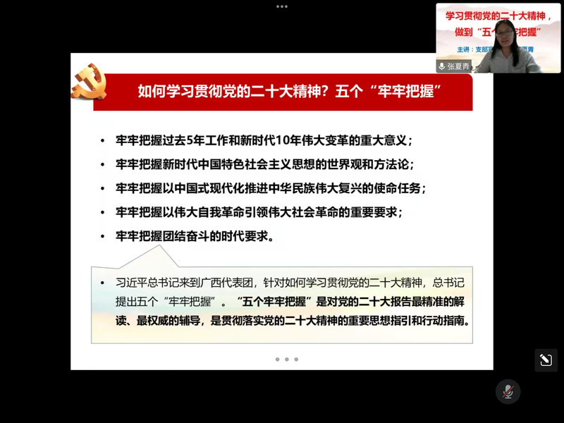 支部宣传委员张夏青讲党课《学习贯彻党的二十大精神 做到“五个牢牢把握”》,根据习近平总书记在参加党的二十大广西代表团讨论时提出的“五个牢牢把握”的基本要求,结合党的二十大报告内容重点解读了“五个牢牢把握”的丰富内涵和精神实质,指出思政课教师应坚持立德树人,培育时代新人以党的二十大精神铸魂,奠定学生的思想基础,使学生更好地投入到中华民族伟大复兴的历史使命之中。