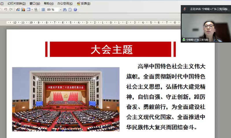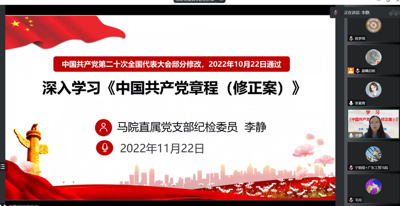 为深入学习领会党的二十大精神,11月22日,马克思主义学院直属党支部开展“学习贯彻党的二十大精神”专题党课活动,此次党课以腾讯会议形式展开,马院全体教师参加会议。
