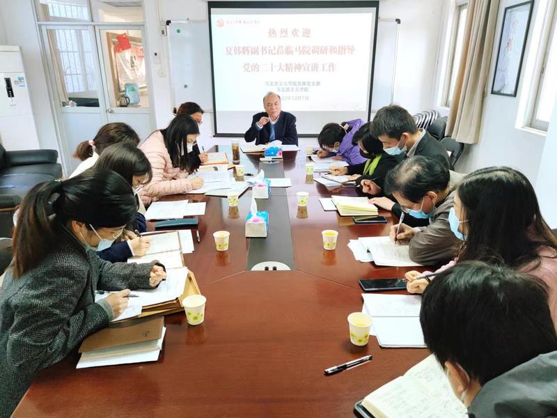 为促进马院教师更深入学习领会、贯彻落实党的二十大精神,推进习近平新时代中国特色社会主义思想“三进”工作,增强365官网思政课教学铸魂育人质量,12月7日上午,学校党委副书记夏韩辉莅临马院调研和指导党的二十大精神宣讲工作。马院当天上午没有课的教师均参加了调研座谈会。