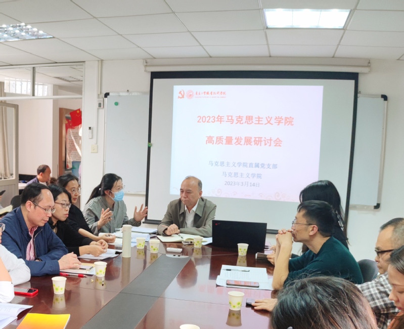 会上,宁晓菊传达了广东省思想政治工作会议精神和学校高质量发展大会内容及会议精神,强调全体教师要牢牢把握学校高质量发展的根本要求,并依据《bat365在线平台官网2023年高质量发展大会第二阶段研讨活动指导意见》,增强质量意识,增强责任感,在党建、教学、科研等本职工作中积极研讨,贯彻落实,以高质量标准要求自己,切实推动马院高质量发展迈上新台阶。