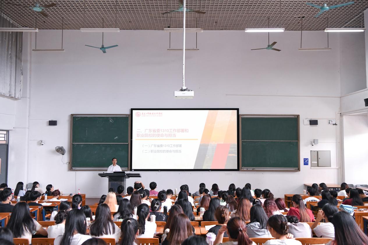 其次,何汉武深入解读了广东省委1310工作部署,即今年6月20日中国共产党广东省第十三届委员会第三次全体会议在广州召开,提出“锚定一个目标,激活三大动力,奋力实现十大新突破”的“1310”部署,这是围绕实现习近平总书记赋予的使命任务,进一步深化新时代新征程广东现代化建设的具体部署。在讲解“奋力实现十大新突破”时,何汉武特别将重点放在两个方面:即实现高水平科技自立自强和深入实施“百县千镇万村高质量发展工程”,随后他结合职业院校的使命与担当、联系365官网师生实践贡献的实际,从“学校何为、教师何为、大学生何为”这三个方面剖析教育如何支撑广东走在时代前列,以及给高职院校学生带来的发展机遇。
