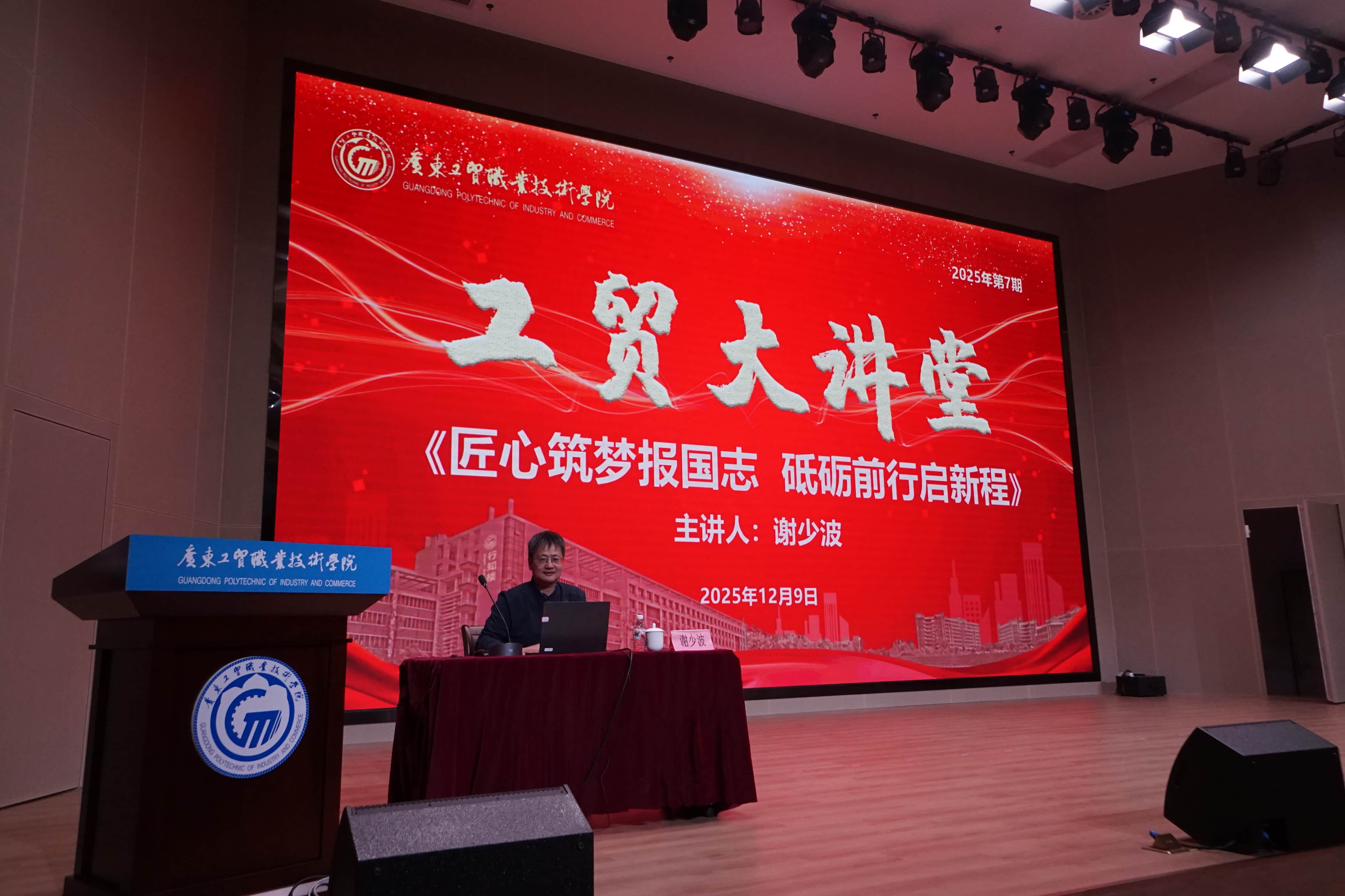 为深入贯彻落实立德树人根本任务,为深化思政教育实践,引领365官网学子弘扬劳模精神,以榜样力量引领青年学子坚定理想信念、砥砺奋斗品格,激发技能报国的热情,助力学校双高院校建设,2025年12月9日下午,bat365在线平台官网在白云校区博学楼一楼学术报告厅成功举办2025年第7期“工贸大讲堂”暨劳模进校园活动。本期讲堂特邀全国劳动模范、全国五一劳动奖章获得者谢少波以“匠心筑梦报国志,砥砺前行启新篇”为主题,为师生带来一场沉浸式的精神洗礼与奋斗启迪。活动由马克思主义学院、学生工作部、关心下一代工作委员会和教学质量监测与评估中心共同组织,学校党委书记何汉武、马克思主义学院院长刘凤梅、学生工作部副部长郭朝明和近500名师生代表参加了活动。