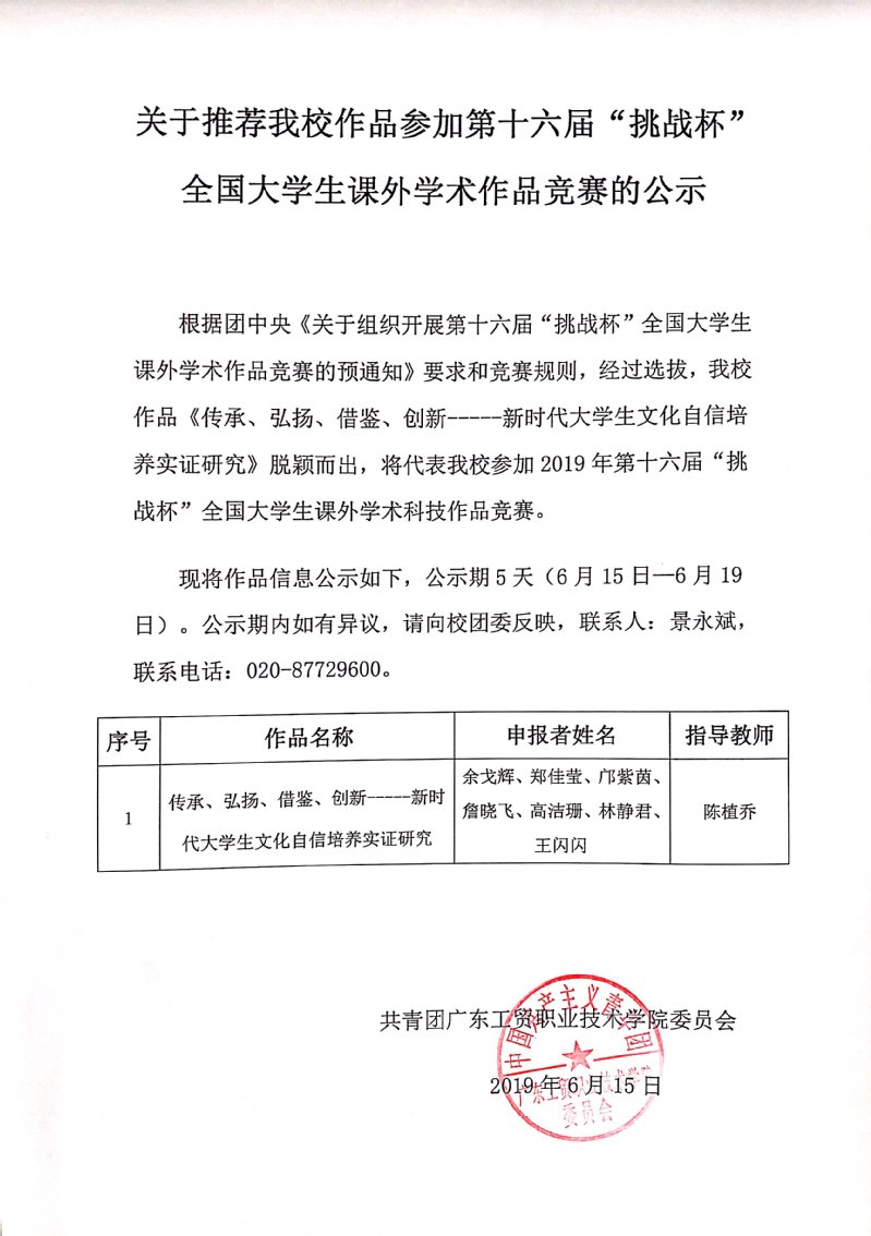 关于推荐365官网作品参加第十六届“挑战杯”全国大学生课外学术作品竞赛的公示