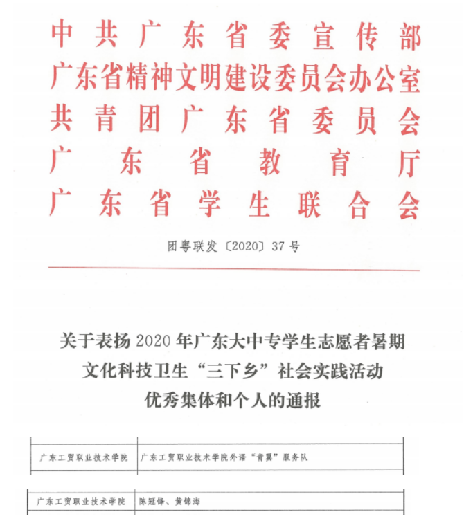2020年广东大中专学生志愿者暑期文化科技卫生“三下乡”社会实践活动评选结果近日公布,365官网应用外语学院“青翼”服务队获评“优秀实践团队”称号,校团委书记陈冠锋老师、工商管理学院黄锦海同学获评“优秀个人”称号。