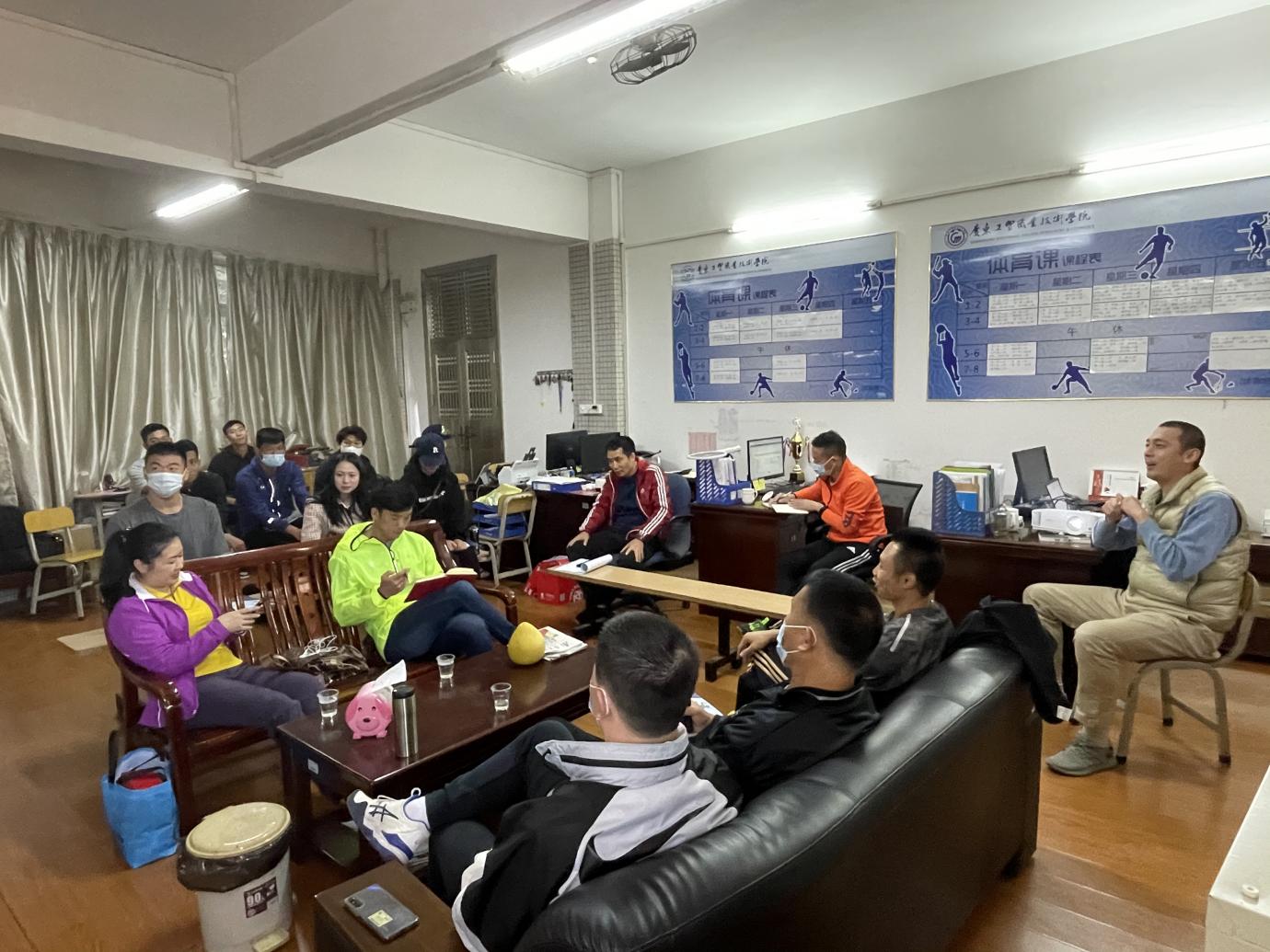 随后,田杨老师从政治安全与师德建设、近期教学工作、校运会筹备进展、学生训练与比赛请假制度、科研与教改、校区上课及办公区域卫生问题、带队比赛与培训申请流程等方面作总结汇报及宣贯,与会人员积极参与讨论。