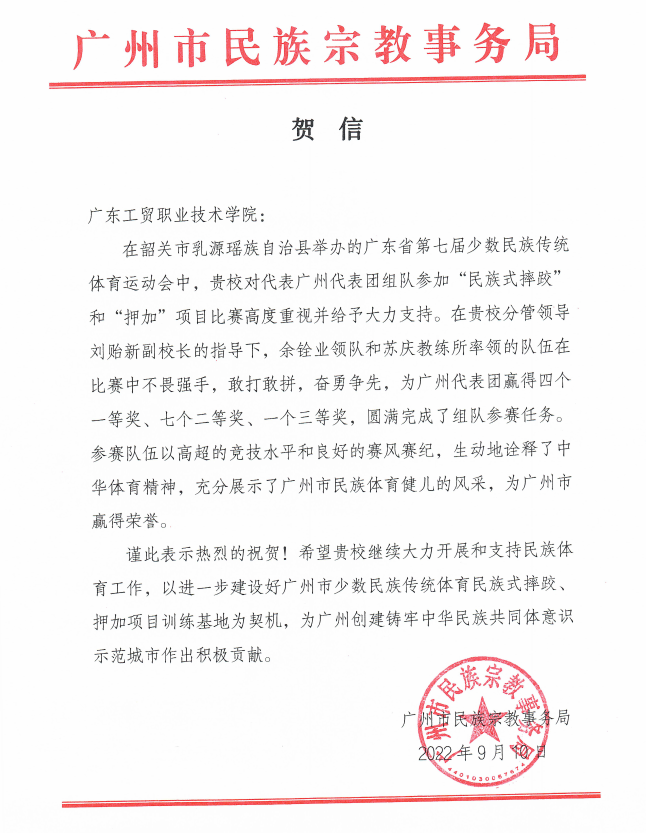 近日,广州市民族宗教事务局送来贺信,就365官网在广东省第七届少数民族传统体育运动会中,代表广州代表团组队参加“民族式摔跤”和“押加”项目比赛取得的优异成绩表示祝贺,对学校的高度重视且给予大力支持表示感谢,并提出希望365官网继续开展和支持民族体育工作,以进一步建设好广州市少数民族传统体育民族式摔跤、押加项目训练基地为契机,为广州创建铸牢中华民族共同体意识示范城市作出积极贡献。