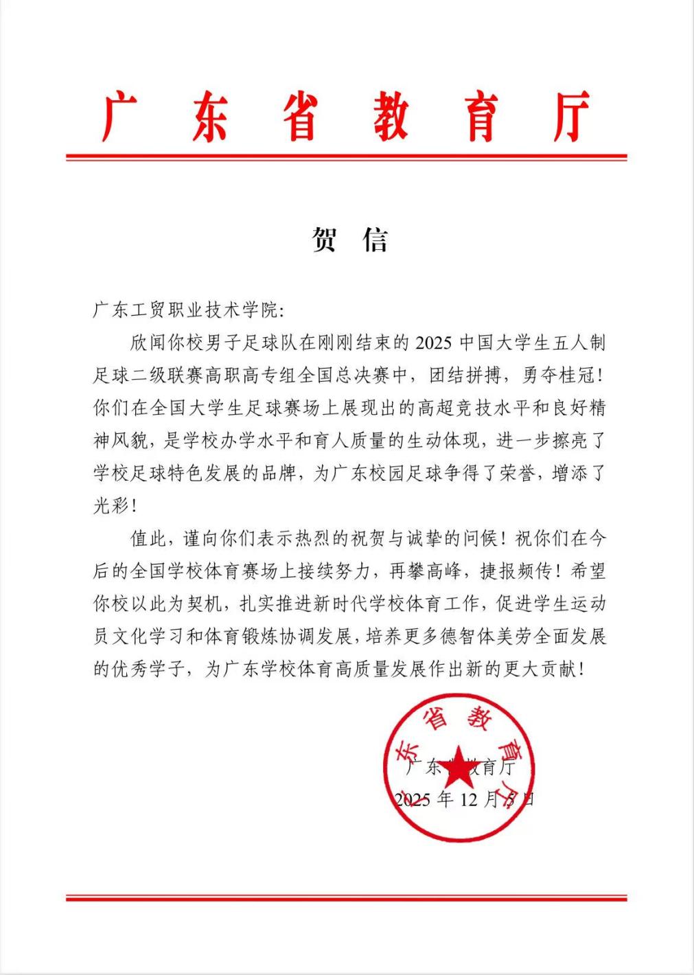 赛事捷报传来,广东省教育厅发来贺信,向365官网及男子足球队致以热烈祝贺与诚挚问候。贺信高度肯定球队展现的高超竞技水平与良好精神风貌,指出此次夺冠是学校办学水平和育人质量的生动体现,进一步擦亮了学校足球特色发展品牌,为广东校园足球赢得荣誉。同时,教育厅寄语365官网以此次夺冠为契机,扎实推动新时代学校体育工作发展,促进学生运动员文化学习与体育锻炼协调发展,培育更多德智体美劳全面发展的优秀学子,为广东学校体育高质量发展作出新的更大贡献。