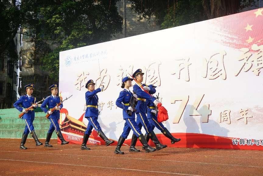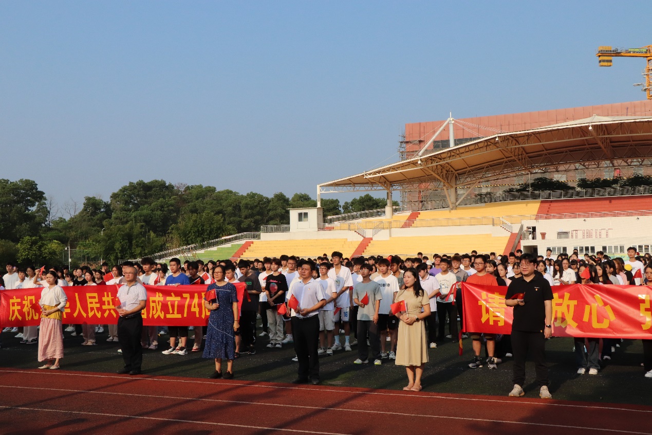 早上8时,伴着初升的朝阳,三校区国旗护卫队踏着坚定的步伐护卫国旗入场,鲜艳的五星红旗冉冉升起,全体师生代表肃然静立,凝眸注视,共唱国歌,在中华人民共和国成立74周年之际向伟大祖国致以崇高的敬意和真挚的祝福。