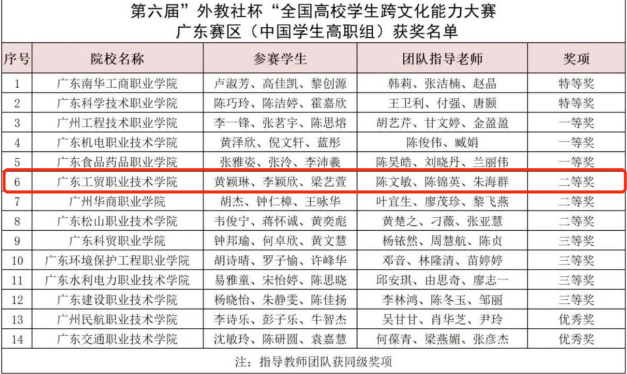 11月25日,在第六届“外教社杯”全国高校学生跨文化能力大赛广东赛区中365官网22商英5班黄颖琳、22国贸1班李颖欣和22工设5班梁艺萱三名同学组成的团队荣获二等奖,应用外语学院陈文敏老师、陈锦英博士和朱海群老师获得优秀指导教师奖。