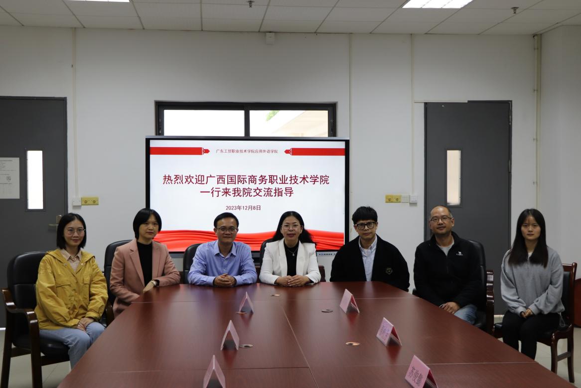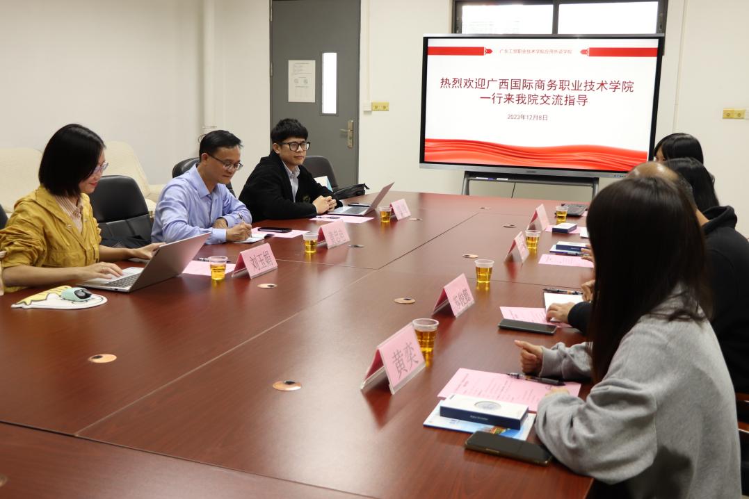 为推进高水平专业建设,进一步深化校企合作,促进职业教育高质量发展。12月8日下午,广西国际商务职业技术学院应用外国语学院院长黄忠电、商务英语教研室主任覃锋、应用英语专业带头人刘王娟一行3人莅临365官网交流考察。应用外语学院院长彭枚芳教授、英语系副主任陈锦英博士、学院办公室苏俊懿老师、黄奕老师参加本次交流活动。
