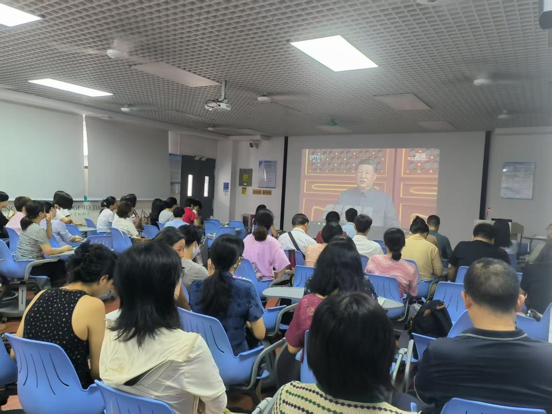 大会伊始,全体教职工集中观看中国人民抗日战争暨世界反法西斯战争胜利80周年纪念日阅兵式直播。阅兵式不仅彰显了我国国防现代化建设的辉煌成就,更凝聚着中华民族在历史淬炼中铸就的不屈不挠、砥砺奋进的精神血脉。此次观看活动极大激发了教职工的爱国热情与责任担当。大家一致认为,作为教育工作者,必将以更加昂扬的精神风貌和饱满的工作热情投身外语教育事业。