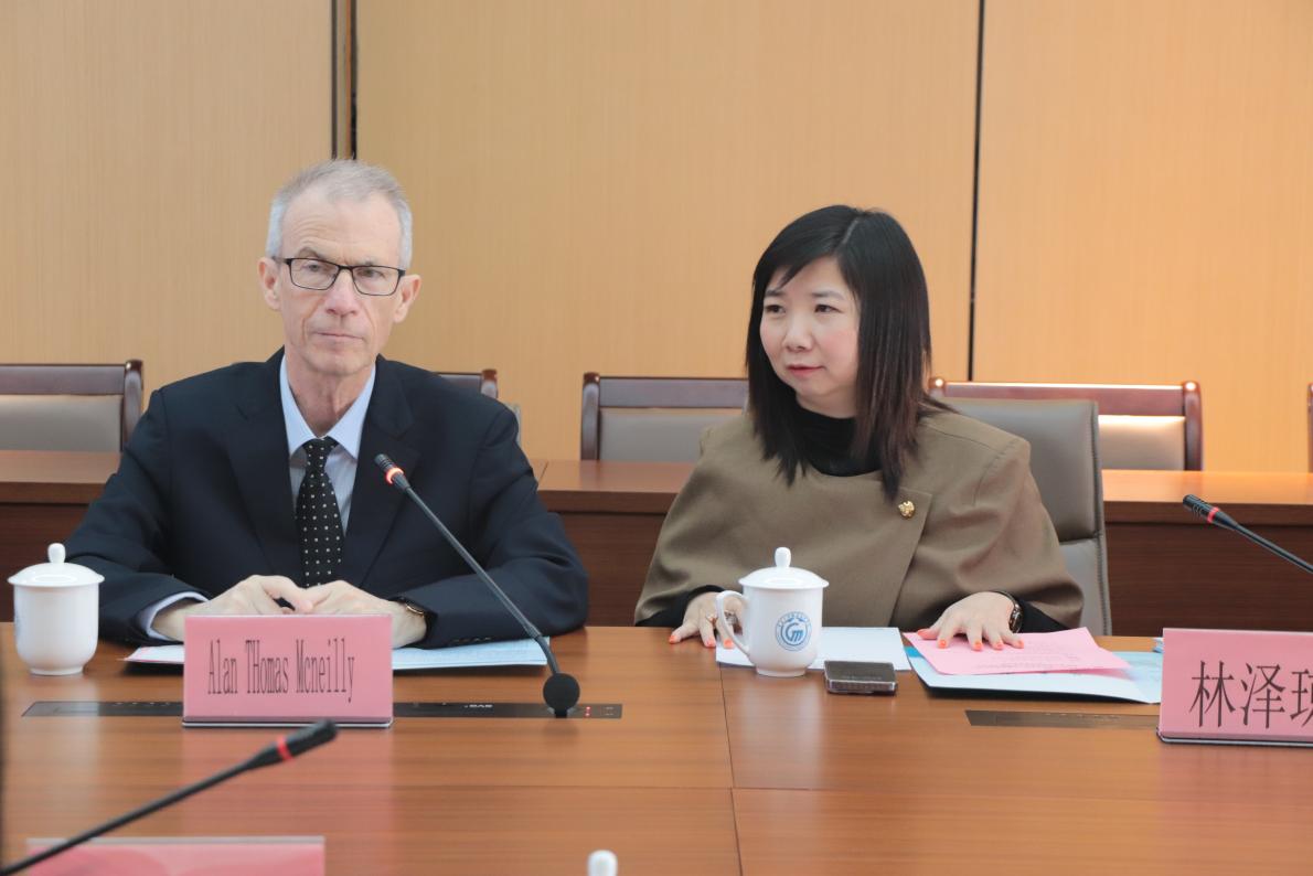 会议围绕多项议题展开。首先,伍炜勤介绍了中方参会人员,林泽琼随后介绍了英方代表团成员。赵红副校长代表学校致欢迎辞,并简要介绍了学校的发展历程、办学特色及国际化建设成果。