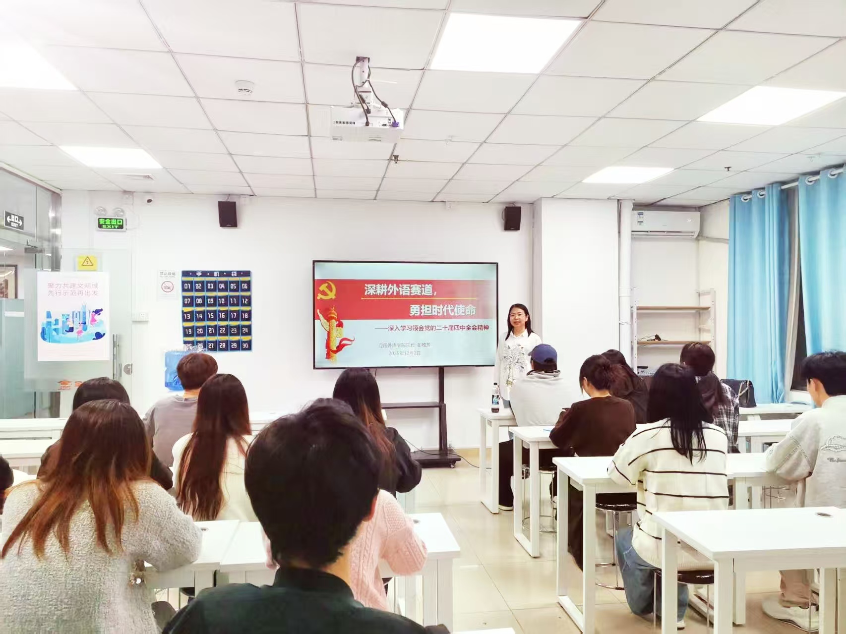 为深入学习贯彻党的二十届四中全会精神,推动全会精神在基层教学一线落地生根,122日,应用外语学院院长彭枚芳前往深圳校外教学点,为24级商务英语专业(现代学徒制班)的全体师生讲授了一堂生动而深刻的专题党课。