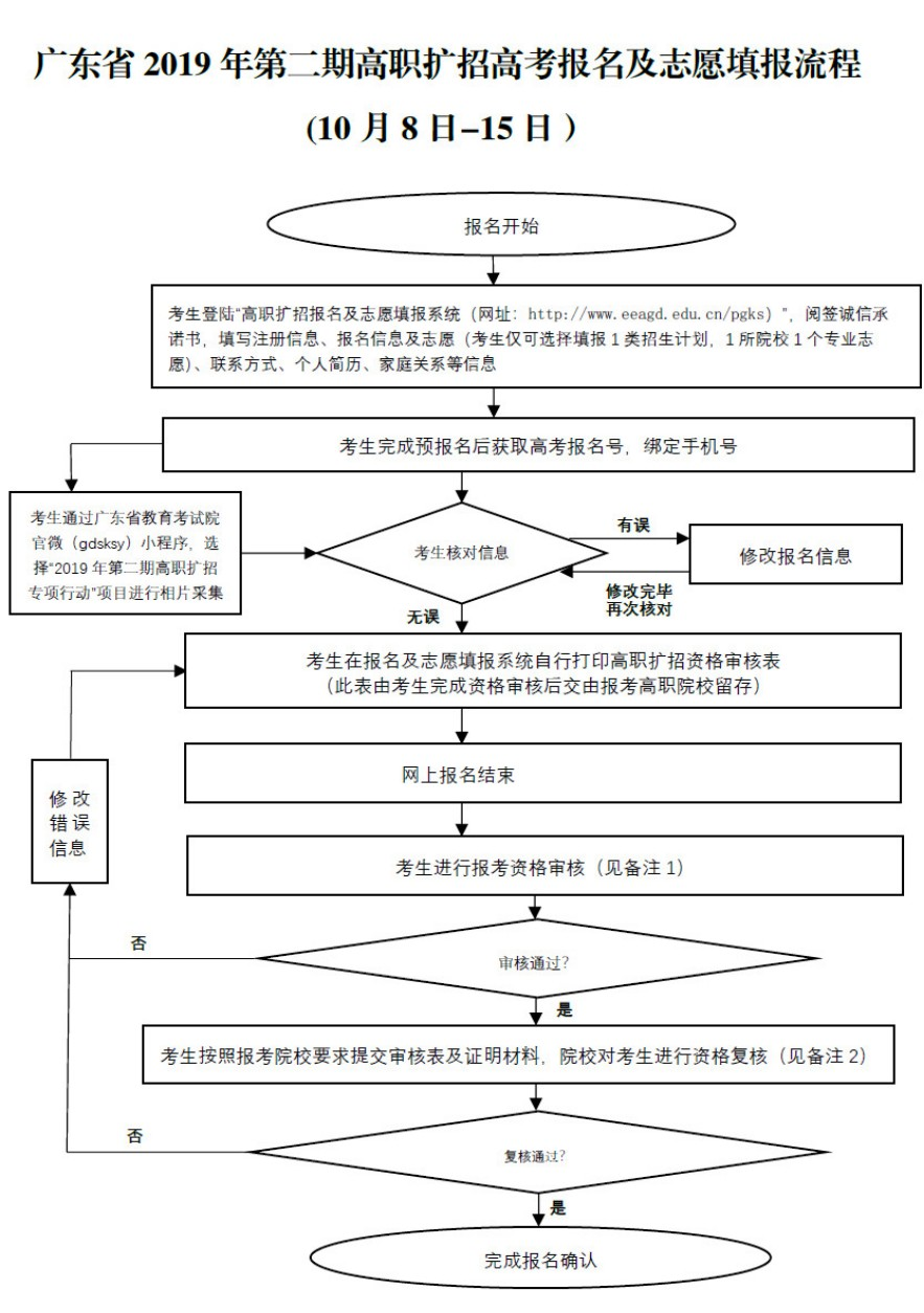 (一)考生在10月12日至10月15日内,登录“广东省2019年第二期高职扩招报名及志愿填报系统(网址:http://www.eeagd.edu.cn/pgks)”,阅读诚信承诺书,填写注册信息、报名信息及志愿(考生仅可以选择填报1类招生计划、1所院校1个专业志愿)、联系方式、个人简历、家庭关系等信息。