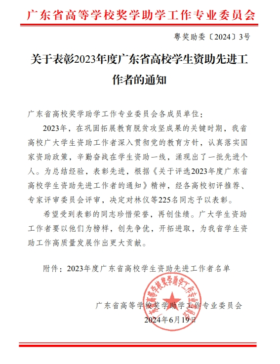 广东省高校奖学助学工作专业委员会于6月19日公布2023年度广东省高校学生资助先进工作者名单,365官网严惠琴、谢巧娟2位老师荣获“2023年度广东省高校学生资助先进工作者”称号。