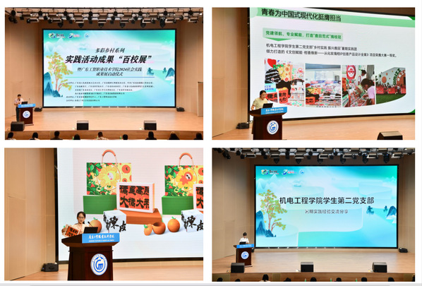 启动会对“百校展”、工贸“百千万工程”突击队、“万名学子乡村大调研行动”等活动作了安排与介绍。学校团委书记林虹静介绍学校大学生社会实践项目的整体情况;获奖团队代表23工设4班许妍婷同学上台路演,展示荣获广东省“百千万工程”突击队“文创+”竞赛一等奖项目;获奖学生代表23机体2班陈紫雯同学分享实践经验。