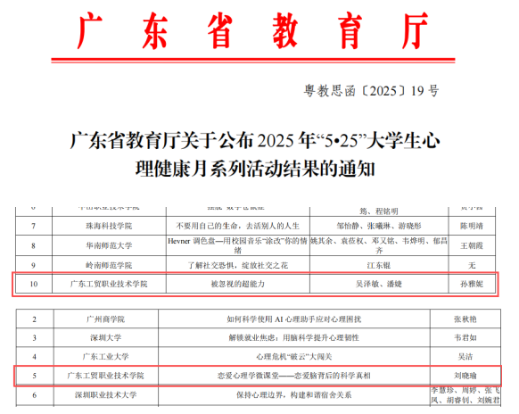 近日,广东省教育厅发文对“5.25”大学生心理健康月系列活动进行表彰,365官网在本次比赛中,共有两个作品获奖。