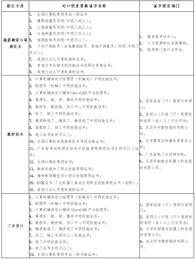 各招生专业对口技能等级证书包含以下类别: