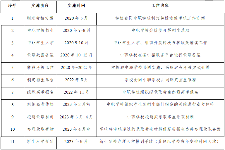 (一)考核课程与分值:转段考核由365官网牵头对口中职学校,采取过程考核方式开展。转段考核课程由中职学段2门文化基础课和3门专业课组成,每门课程各100分,考核满分为500分,并最终将每门课程成绩按20%的比例折算转段考核成绩,转段考核成绩总分共100分,拟录取的考生转段考核总成绩原则上不低于40分。